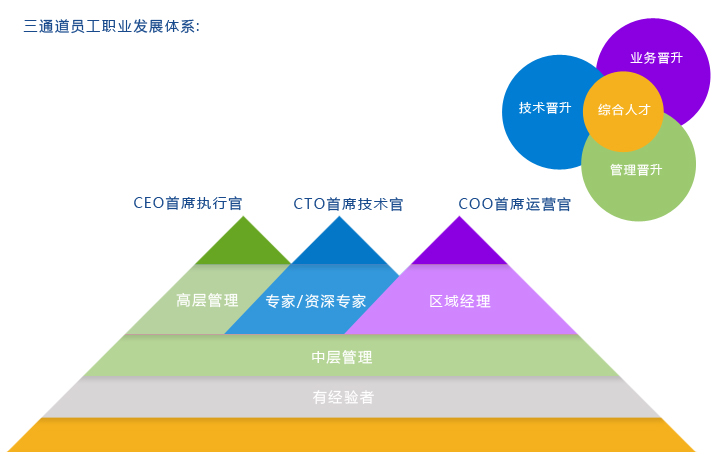 在公司人才戰略的指引下,我們積極拓展員工個人發展空間,為員工設計個性化的職業生涯發展規劃。立足于完善的企業管理制度與培訓體系,我們為員工提供技術通道晉升、業務通道晉升與管理通道晉升的“三條通道”發展模式,從而使員工在基于個人興趣與專長的基礎上更好的實現自身價值與公司價值的結合,實現自身與公司的一同成長。